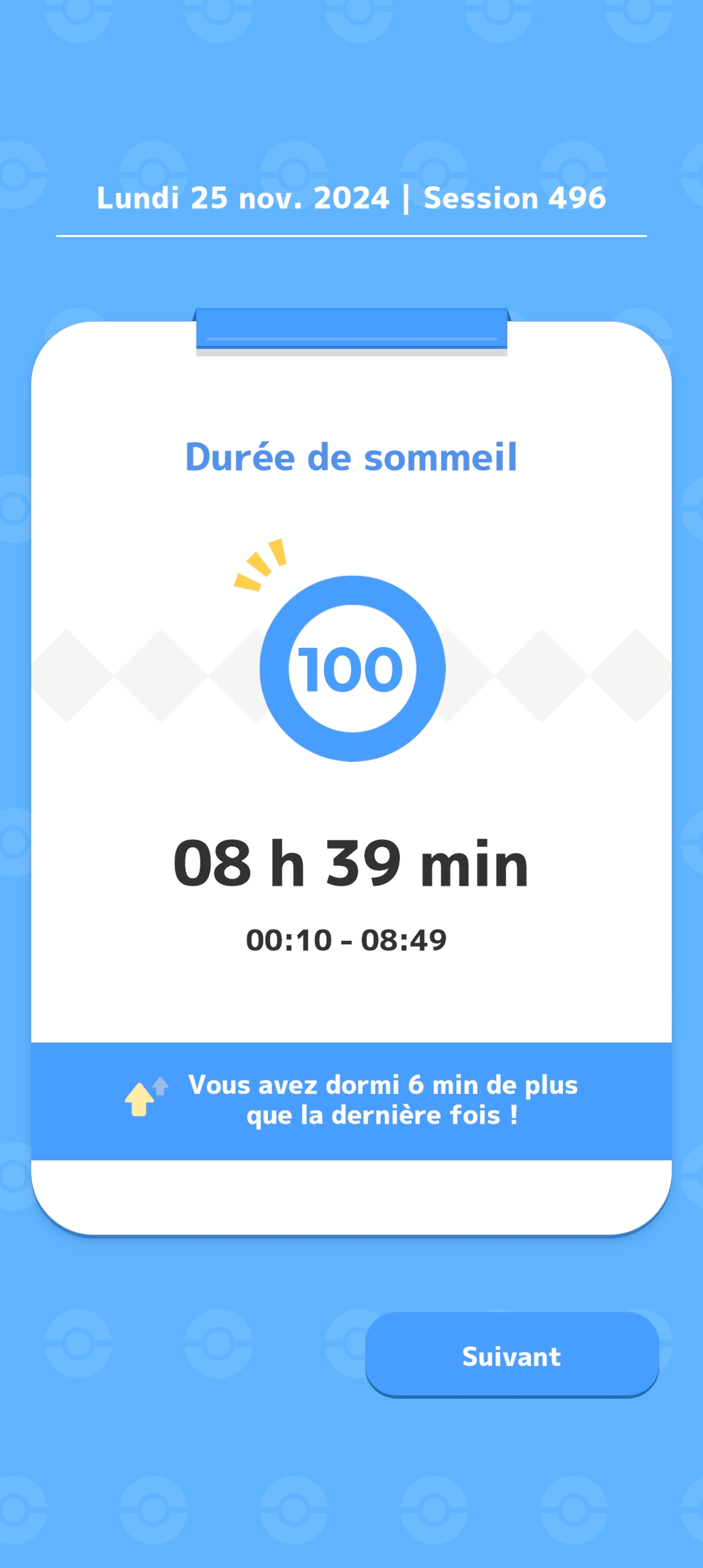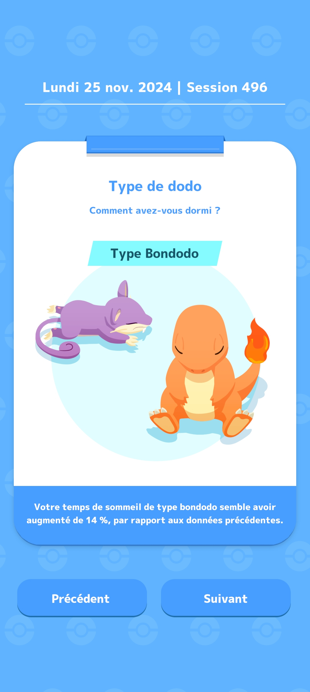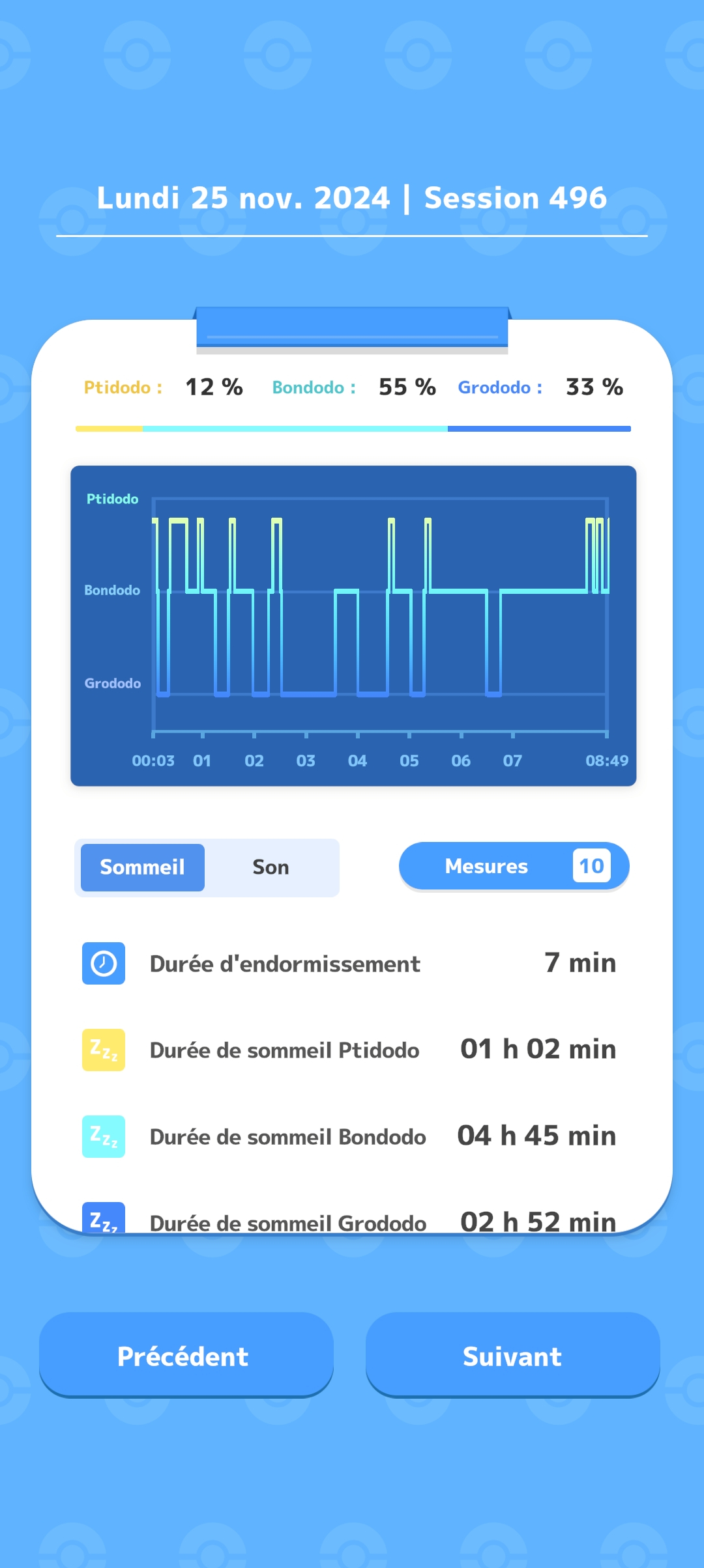 Pokémon Sleep est une application qui permet de mesurer son rythme de sommeil au quotidien, jusqu'à 2 fois par jour. Les données mesurées pendant le sommeil sont ensuite envoyées sur le serveur du jeu. Mesurer son sommeil en plus des informations mesurées offre de nombreux avantages :