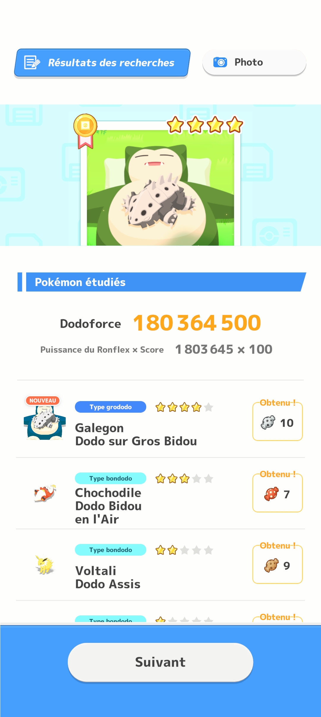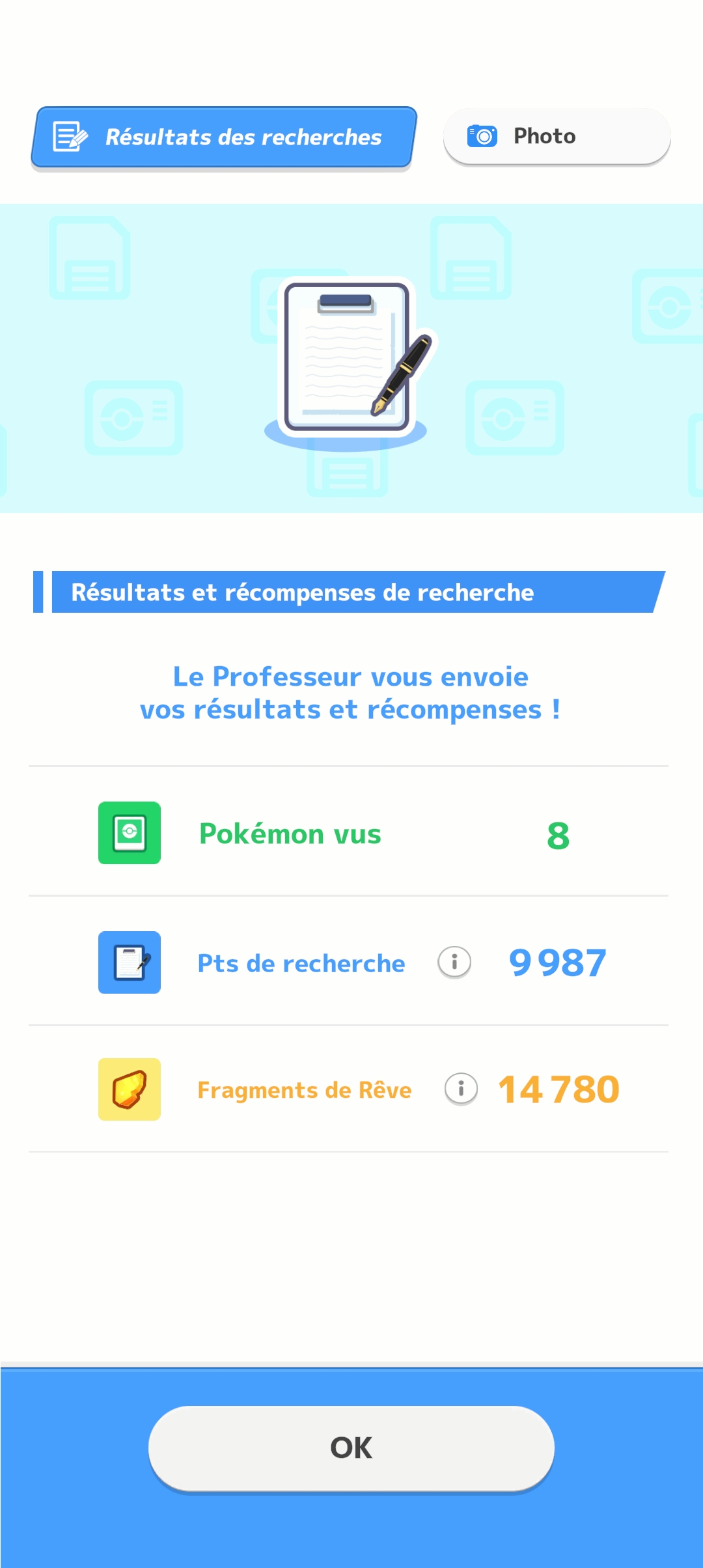 • Sur le dernier écran, vous avez les résultats et récompenses de recherche : vous pouvez voir le nombre de Pokémon vus (le nombre de styles de dodo étudiés), ainsi que les points de recherche et Fragments de Rêve