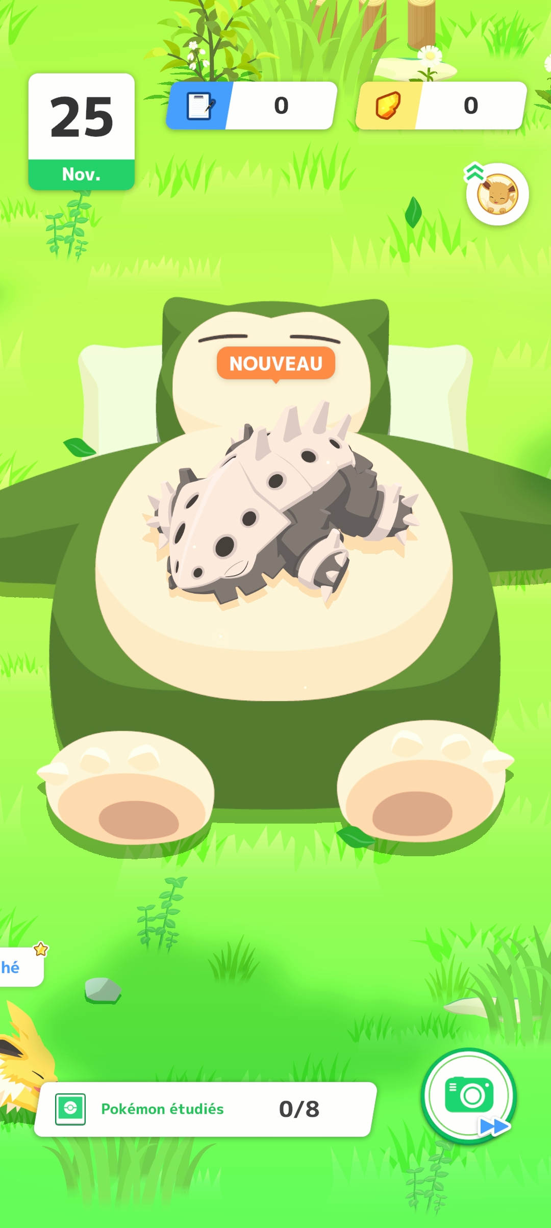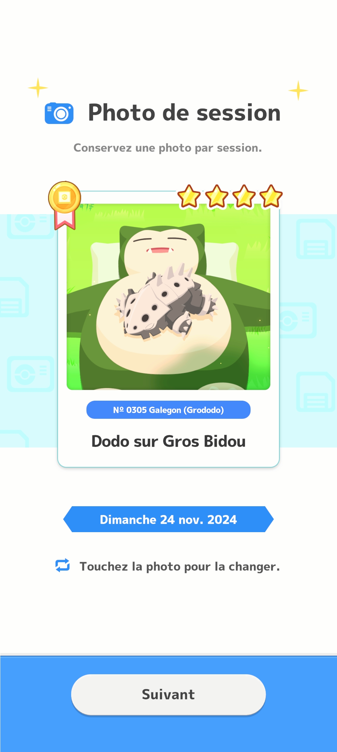 • Parmi les styles de dodo étudiés, vous pouvez choisir une photo de l'un d'entre eux. La photo choisie donne 1 ou 2 bonbons de la ligne évolutive du Pokémon à vos amis. Ils pourront voir le nombre de bonbons obtenus et la photo choisie dans le Groupe de recherche.