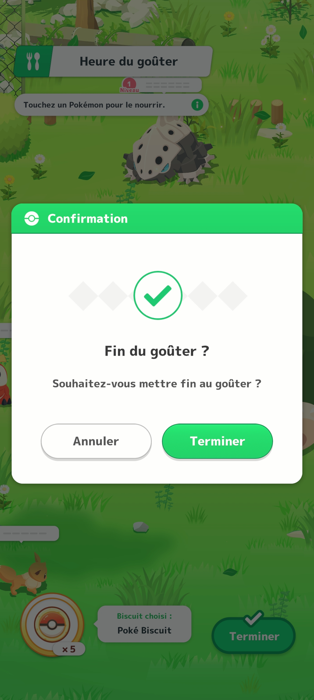 (voir cette page pour les chiffres). Chaque Pokémon peut manger au moins 2 biscuits avant d'être rassasié. Lorsque vous ne voulez plus de donner de biscuits aux Pokémon, cliquez sur le bouton en bas à droite pour mettre fin au goûter. À votre première session de sommeil de la journée, vous avez gratuitement un Biscuit Bonus