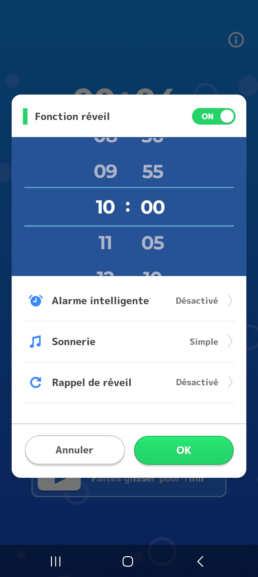 Vous pouvez décider de combien de temps avant votre réveil votre alarme pourra se déclencher (15, 20, 30 ou 45 minutes).