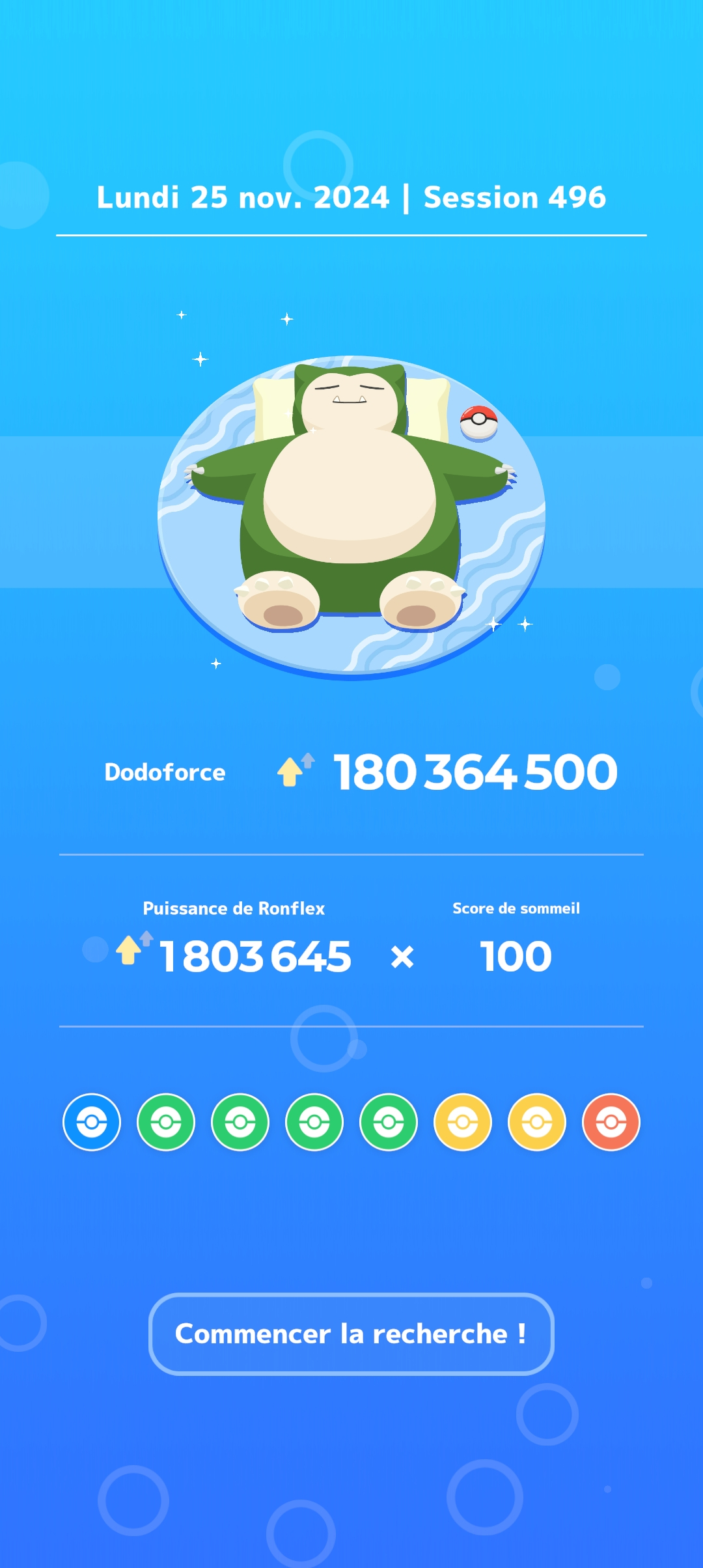 • La dodoforce obtenue est simplement le produit de la Puissance de Ronflex et de votre score de sommeil (un bonus multiplicatif peut être appliqué lors de certains évènements). La couleur des icônes Poké Ball en dessous indique un style de dodo avec un certain nombre de ★. Le style de dodo obtenu par encens n'est pas représenté.