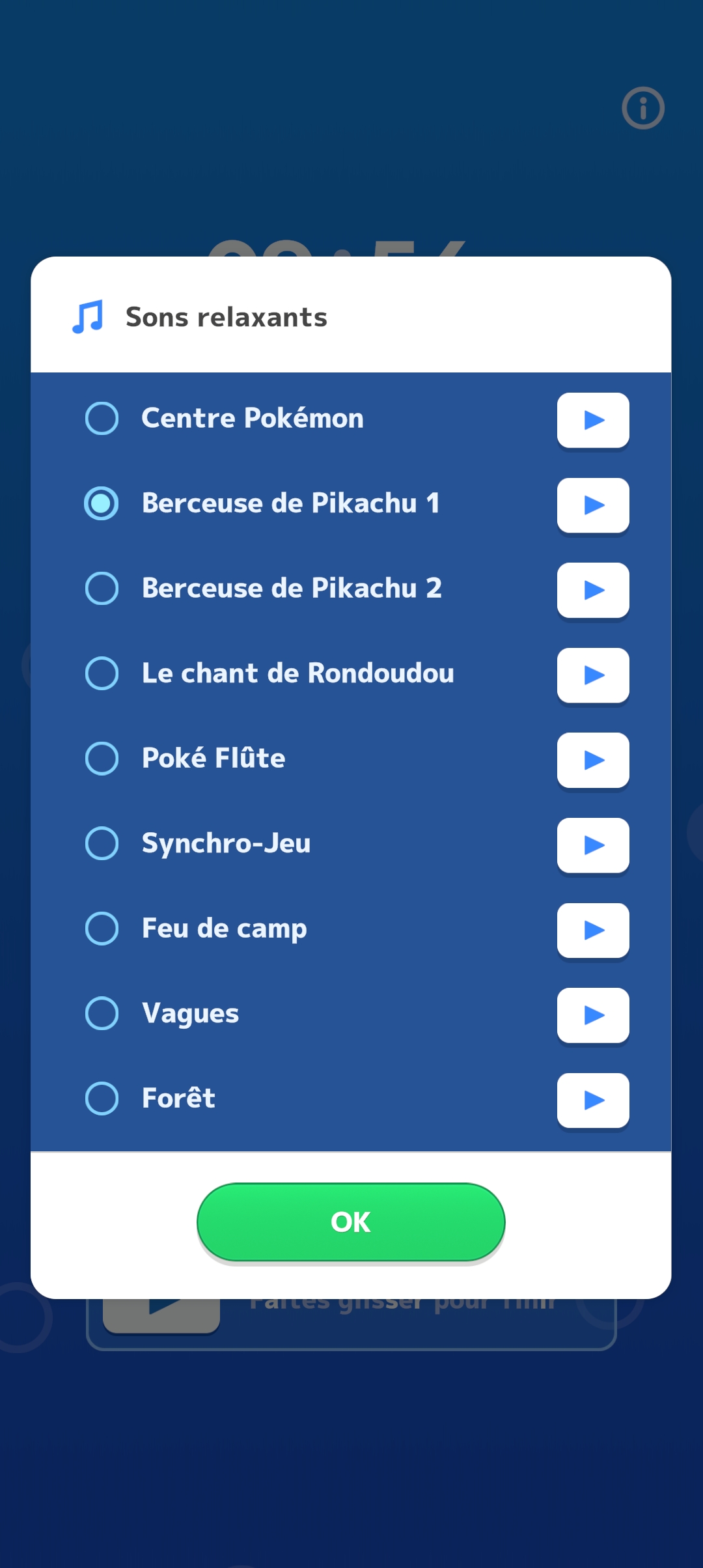 • En cliquant sur l'icône ♬, vous avez une option pour choisir un son relaxant qui peut vous aider à vous détendre et vous endormir. Le Centre Pokémon est le seul son par défaut, mais vous pouvez aussi télécharger les suivants :