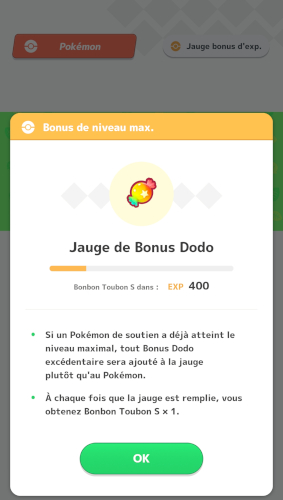 Remarque : L'un n'empêche pas l'autre, mais gardez en tête que malgré cette jauge, le plus rentable pour exp. un Pokémon est toujours de dormir avec lui et de récupérer les bonbons qu'il peut donner pendant la journée. Un Bonbon Toubon S