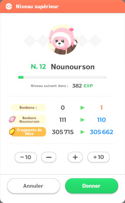 . Chaque bonbon donné rapporte 25 EXP avec une nature neutre en EXP, 21 EXP avec une nature négative en EXP et 30 EXP avec une nature positive en EXP. Le nombre de Fragments de Rêve