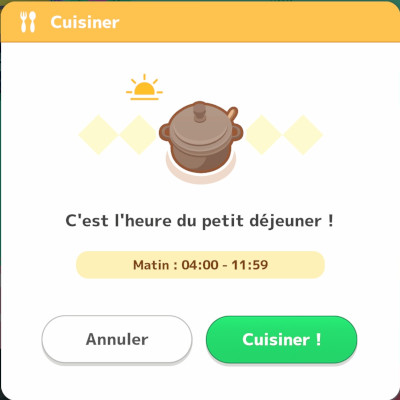 Vous pouvez utiliser des Ingrédients pour cuisiner des plats jusqu'à 3 fois par jour, matin (04:00-11h59), journée (12:00-17h59) et soir (18h-03:59). À chaque changement de zone, le jeu choisit au hasard un type de plat, Currys et ragoûts, Salades ou Desserts et boissons, chacun ayant une liste de recettes différentes. Pour respecter les recettes, il faut combiner certains ingrédients dans des quantités minimum. Certaines recettes rapportant plus de puissance que d'autres (c'est en partie lié au nombre total d'ingrédients de la recette), il est conseillé de cuisiner les plus puissantes dans la mesure du possible (voir cette page pour plus d'informations).