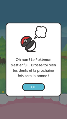 À la fin du temps imparti, vous avez la possibilité de capturer le Pokémon sauvé en touchant simplement l'écran pour lancer une Poké Ball. Si vous vous êtes bien brossé les dents, ce Pokémon vient s'ajouter à votre Pokédex. Dans le cas contraire, il s'enfuit et il vous faudra alors mieux vous brosser les dents la prochaine fois. Pour votre premier Pokémon capturé, vous recevez un Chapeau Évoli, ainsi qu'une première Vignette (Pikachu sur dent). Si vous avez réussi à vous débarrasser entièrement de la zone des bactéries ainsi que le Pokémon qui est apparu, vous avez une capture garantie avec une Master Ball !