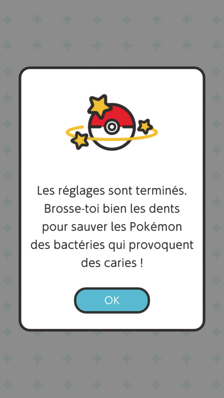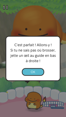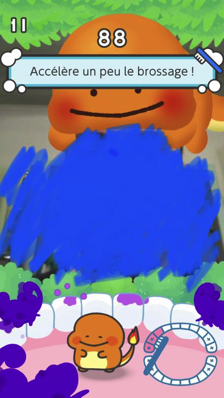 Lors de votre premier brossage, on vous propose de vous entraîner. Vous vous voyez en train de vous brosser les dents et votre starter s'affaire dans votre bouche afin d'éliminer toutes les bactéries. Accélérez quand le jeu vous le demande, et n'hésitez pas à surveiller le schéma de votre bouche en bas à droite pour plus localiser votre brossage.