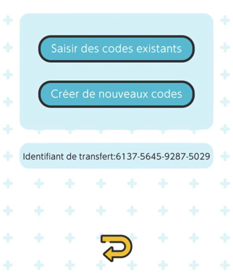 3/ Sur votre nouvel appareil, choisissez "Saisir des codes existants" puis rentrer les informations préalablement notées (ID et mot de passe) pour récupérer votre partie. Attention, cette manoeuvre entraîne automatiquement une réinitialisation des données sur l'ancien appareil et les données transférées remplaceront celles sur votre appareil actuel.