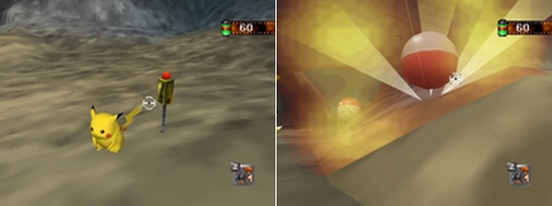 A l'arrivée dans le circuit, on peut apercevoir un Pikachu près d'un panneau ; à chaque photographie qui le centre, il s'en va plus loin. Trois prises permettront de le faire monter sur un Électrode passant. Un Pikachu roulant sur l'Électrode est une photographie bonus qui vous rapportera plus de points. Avant de retourner à lui, à votre gauche, un Élektek poursuit un autre Électrode ; prenez – le en photo avant qu'il ne se retourne. A votre droite, l'explosion de l'Électrode précédent aura retenti. Un petit truc : un Électrode explosé ou en pleine explosion rapporte plus de points que si celui – ci est simplement statique ou en mouvement.Plus loin, on peut apercevoir des « queues » dans le plafond ; dès que le second Pokémon roulant aura explosé, c'est tout un groupe de Coconfort qui descendra momentanément. Il faut noter que chaque explosion les fait retomber. A la fin de ce premier passage, une porte s'ouvre ; soyez vif pour prendre en photographie le Nosferapti qui passera. Dans ce second passage, il n'y a pas, pour l'instant, de photographies intéressantes. L'œuf de gauche nous sera utile plus tard. Juste avant la seconde porte, il y a à votre gauche un spectre inidentifiable ; prenez – le en photographie, car l'analyse révèlera un Spectrum bien en prise. A la droite de cette même porte, un Magicarpe va vivement sauter, il serait donc intéressant de l'ajouter à notre Rapport.