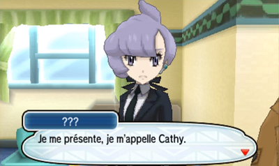 Cathy est un personnage méconnu apparu dans la version Émeraude. Elle est la meneuse de la Tour de Combat et apparaissait seulement au bout d'un nombre conséquent de victoires d'affilés. Sa présence à Alola est très mystérieuse mais elle a l'air d'avoir un lien étroit avec les Ultra-Chimères et cela sera l'objet d'une enquête policière. | |