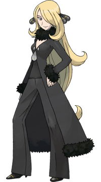 Cynthia est le maître Pokémon de la région de Sinnoh, elle est également le premier personnage féminin a avoir tenu ce rôle. Cynthia en plus d'être l'ultime adversaire du joueur, l'aide tout au long de son aventure. Elle possède de grandes connaissances relative à la mythologie du monde Pokémon et passe le plus clair de son temps à faire des recherches sur les Pokémon légendaires. Très populaire auprès des fans, elle a fait de nombreuses apparitions, notamment lors d'events sur Pokémon HG/SS mais également comme adversaire dans Pokémon Noir et Blanc. Cynthia est toujours accompagnée de son fidèle Carchacrok. | |