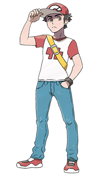 Red est le tout premier personnage jouable de la série. Originaire du Bourg-Palette, ce dresseur a reçu son premier Pokémon des mains du Professeur Chen aux cotés de son ami et rival Blue. Red est connu pour son puissant Pikachu qui est à ce jour le Pokémon possédant le plus haut niveau dans l'histoire du jeu. Si il est très populaire auprès des fans, c'est notamment pour son apparition comme ultime adversaire dans les jeux Or, Argent, Cristal, SoulSilver et HeartGold. Un de ses signe distinctif est qu'il ne parle jamais, l'intégralité de ses dialogues consiste en une série d'ellipses ou de signes de ponctuation. | |