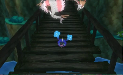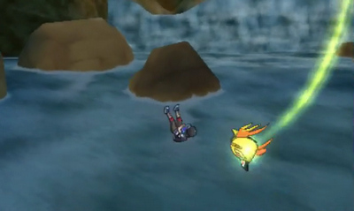 N’écoutant que votre courage, vous le protégez avec votre corps. Cependant, le pont vole en éclat et vous êtes précipité dans le ravin. Heureusement, Tokorico, le Pokémon gardien de l’île, vous sauve in extremis d’une mort certaine et vous ramène sur la terre ferme.