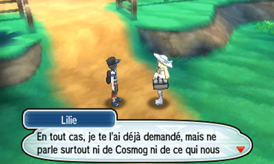 Le lendemain matin, l’assistante du professeur vient frapper chez vous et vous demande de rejoindre celui-ci à son laboratoire. Avant de partir, votre mère vous remet de l'argent et fait la rencontre de Lilie : celle-ci vous révèle en passant que son Pokémon se nomme Cosmog et vous demande de garder le secret de son existence.