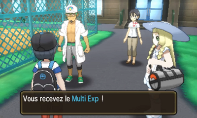 Sur place, vous retrouvez le professeur Euphorbe qui vous remet le Multi Exp et vous informe que vous devez battre 4 dresseurs pour votre première leçon.