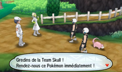 Au bout du chemin, vous tombez sur des membres de la fondation Æther et de la Team Skull en pleine dispute à propos d'un Pokémon Volé.