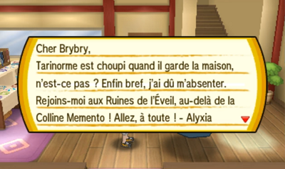 Une fois vos achats terminés, rendez-vous dans le magasin d'Alyxia, la Doyenne d'Akala, là son Tarinorme vous remet une lettre qui vous informe qu'elle vous attend aux Ruines de l'Éveil.