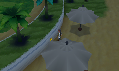 Derrière un parasol.