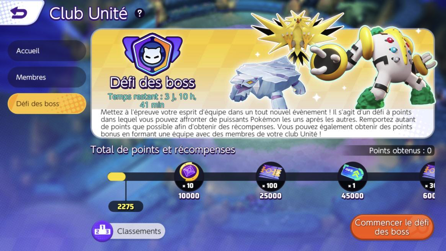 Disponible depuis le 21 juillet 2022 (et uniquement sur certaines périodes définies), ce défi vous permet de gagner divers objets et autocollants si vous coopérez avec des membres de votre club Unité pour vaincre les différents Boss du jeu (Électhor, Regigigas,...).