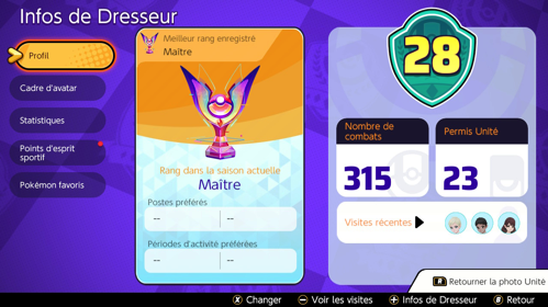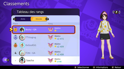 Vous pouvez consulter le classement mondial des combats classés via le menu sur l'écran principal (bouton X) pour voir les informations des meilleurs joueurs du moment. Divers types de classement peuvent être consultés : par Pokémon, par points marqués, par série de victoires...