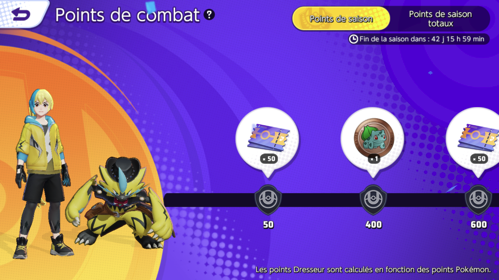 Disponibles depuis la Saison 5, les points de combat engrangés dans chaque saison vous permettent désormais d'obtenir divers objets et médailles de renfort Pokémon. Plus vous en obtenez, plus vous obtiendrez de récompenses !