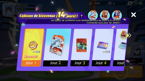 Le jeu vous offre également des récompenses quotidiennement si vous vous connectez au moins 1 fois par jour ! Lors du lancement, un Bonus de Connexion spécial avait été rendu disponible et permettait l'obtention de combattants, Holo-Costumes, ressources et éléments de personnalisation.