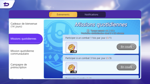 Un système de missions quotidiennes est aussi disponible et vous permet de récupérer essentiellement de la monnaie pour le jeu (Pièces et Tickets Æos). Toutes ces missions sont assez simples à réaliser pour vous assurer d'obtenir vos gains chaque jour.