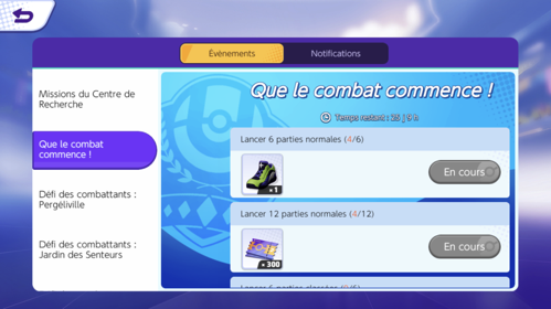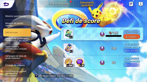 Comme dans de nombreux autres jeux, vous pouvez effectuer des défis limités dans le temps vous offrant surtout des éléments de personnalisation mais aussi des combattants Pokémon. Ces défis sont remplacés par d'autres une fois la période de disponibilité écoulée (assurez-vous de les terminer à temps pour récupérer toutes les récompenses).