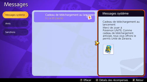 Via le menu, vous pouvez accéder à vos messages et récupérer, durant certaines périodes, des lots uniques (comme des combattants Pokémon). Vous pouvez aussi consulter les notifications de vos amis ainsi que vos sanctions.