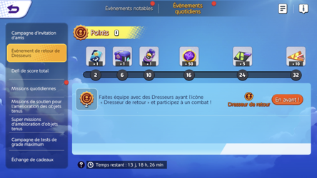 Faites équipe avec des Dresseurs ayant l'icône "Dresseur de retour" (qui n'ont pas joué au jeu depuis 14 jours ou plus) et participez à un combat du 22 septembre au 6 octobre ! Plus vous participez à des combats avec ce type de dresseurs, plus vous obtiendrez de récompenses.