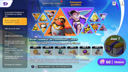 En utilisant 60 Gemmes Æos, vous pouvez débloquer un nouveau bonus de connexion sur 7 jours pour gagner des Tickets, des Boost d'énergie,... et même un Holo-costume (au choix parmi certains spécifiques proposés).