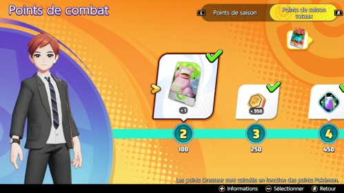 Chaque combat de Pokémon UNITE vous fait gagner des Points de saison en cours et des Points de saison totaux. Ces points cumulés fonctionnent comme de l'expérience et si vous en gagnez suffisamment, vous montez en niveau. À chaque niveau gagné, vous obtenez aussi de nouvelles récompenses, dont des Objets de combat, de la monnaie et des Médailles de renfort Pokémon !