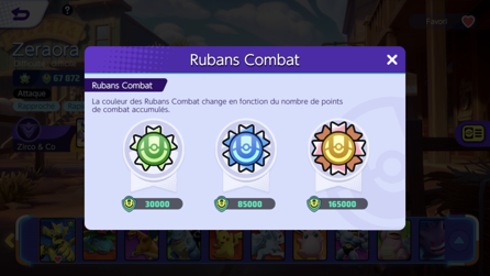 Rubans Combat : Au fur et à mesure que vous combattez avec un Pokémon, vous engrangez des points avec lui. Un ruban lui est attribué selon le nombre total de points obtenus.