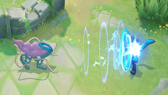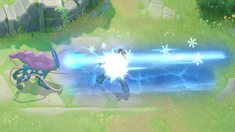 Récupération : 5 secEffet : Le lanceur libère un rayon d'énergie glaciale dans la direction indiquée, ce qui inflige des dégâts et applique un effet ralentissant aux Pokémon adverses touchés. Si les Pokémon adverses sont trempés quand la capacité les touche, ils deviennent alors gelés. Si cette capacité touche une zone inondée, cette zone devient alors gelée. Cette capacité a un maximum de 2 utilisations.