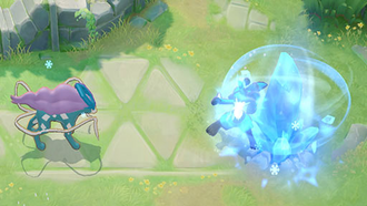 Effet : Quand le Pokémon inflige des dégâts à un Pokémon de l'équipe adverse gelé dont les PVs sont en dessous d'un certain pourcentage, ce dernier est instantanément mis K.O. Quand le Pokémon utilise une capacité, il obtient un bouclier et sa jauge cristal augmente. Ce bouclier peut être accumulé jusqu'à 2 fois. Quand le Pokémon utilise Siphon ou Surf, la zone parcourue par la capacité devient inondée. Si ce Pokémon gèle une zone inondée, les Pokémon adverses qui se trouvent dans la zone inondée seront eux aussi gelés. Dégâts spéciaux (réduits par la Déf. Spé. des cibles) Dégâts - Gel : 100 + 7*(lvl-1) + 25% Atq. Spé.Bouclier : 200 + 50% Atq. Spé. |