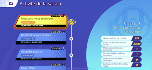 La saison 13 du Pass de Combat s'est déroulée du 26 décembre 2022 au 3 mars 2023 (66 jours). Vous pouviez notamment obtenir un Holo-Costume Premium pour Mouscoto, une fois le niveau 100 atteint ! Retrouvez tous les détails des missions et récompenses à obtenir durant cette saison ci-dessous.