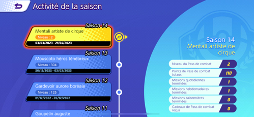 La saison 14 du Pass de Combat s'est déroulée du 27 février 2023 au 21 avril 2023 (48 jours). Vous pouviez notamment obtenir un Holo-Costume Premium pour Mentali, une fois le niveau 100 atteint ! Retrouvez tous les détails des missions et récompenses à obtenir durant cette saison ci-dessous.