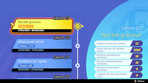 La saison 23 du Pass de Combat s'est déroulée du 17 avril 2024 au 6 juin 2024 (50 jours). Vous pouviez notamment obtenir un Holo-Costume Premium pour Noctali une fois le niveau 100 atteint ! Retrouvez tous les détails des missions et récompenses à obtenir durant cette saison ci-dessous.