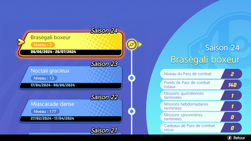 La saison 24 du Pass de Combat s'est déroulée du 6 juin 2024 au 26 juillet 2024 (50 jours). Vous pouviez notamment obtenir un Holo-Costume Premium pour Braségali une fois le niveau 100 atteint ! Retrouvez tous les détails des missions et récompenses à obtenir durant cette saison ci-dessous.