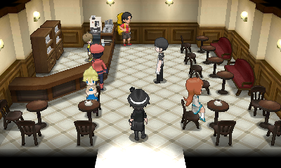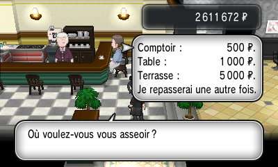 Il y a trois autres cafés (à Relifac-le-Haut, Romant-sous-Bois et Flusselles), dont la fonction est très utile pour vous aider à remplir votre Pokédex.Il vous faut payer pour entrer : le prix ainsi que les clients varient selon que vous vous installez au comptoir, à table ou en terrasse.
