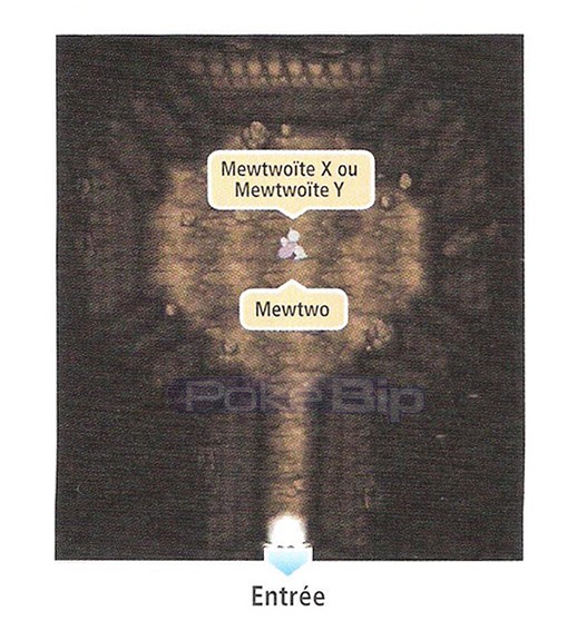 Mewtwo se trouve dans la Grotte Inconnue du Village Pokémon et tient la Mewtwoïte X ou la Mewtwoïte Y selon votre version. Il ne peut bien évidemment pas utiliser sa Méga-Évolution pendant le combat puisqu'il n'a pas de Dresseur.Dresseurs