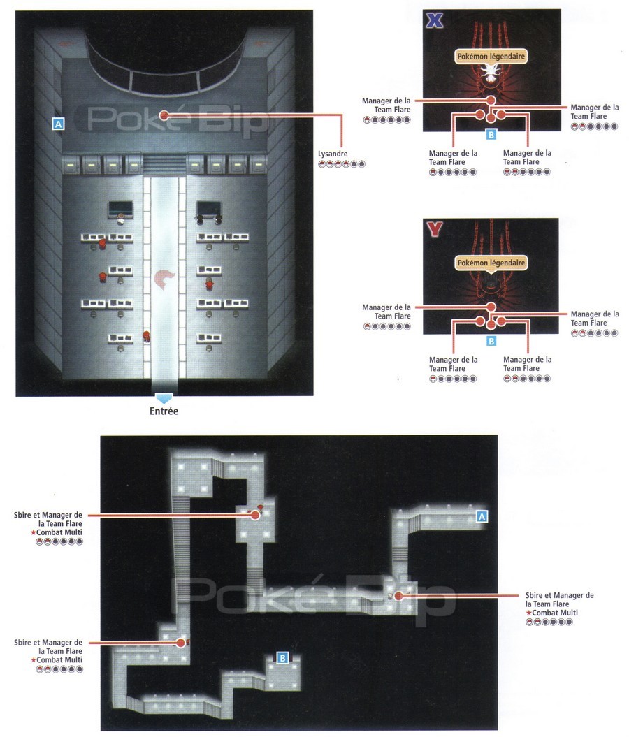 Ces Pokémon emblématiques des versions X et Y se trouvent à Cromlac'h, dans le repaire secret de la Team Flare. Vous rencontrerez forcément le Pokémon légendaire mascotte de votre jeu durant le scénario et sa capture est obligatoire pour avancer. L'autre Pokémon est en revanche introuvable.Dresseurs