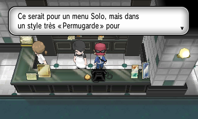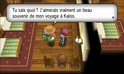 | Randonneur | Kalos, c'est pas mal, mais comparé au pays d'où je viens... Il y a une ville qui est tellement... tu vois... telleme... Et puis zut, tu devrais aller voir toi-même ! | Kalos, c'est pas mal, mais comparé au pays d'où je viens... Il y a ce truc qui est tellement... tu vois... telleme... Et puis zut, tu devrais aller voir toi-même ! | Kalos, c'est pas mal, mais comparé au pays d'où je viens... Le Maître est tellement... tu vois... telleme... Et puis zut, tu devrais aller voir toi-même ! | Kalos, c'est pas mal, mais comparé au pays d'où je viens... Tiens, on a ce genre de choses, profites-en ! |