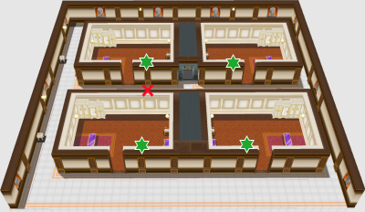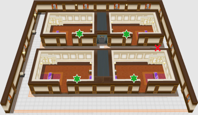 Astuce : voici des cartes des lieux avec en rouge les passages bloqués et en vert les lits à refaire, n'hésitez pas à faire un itinéraire selon la difficulté !