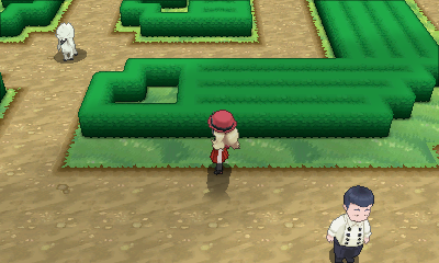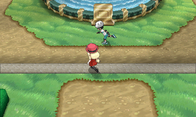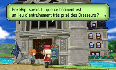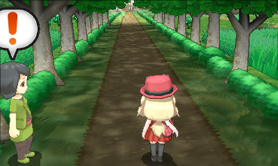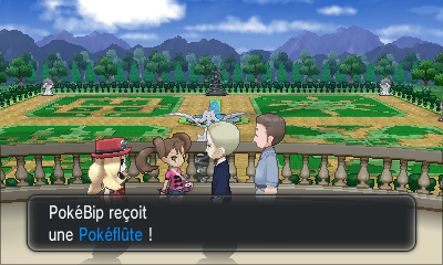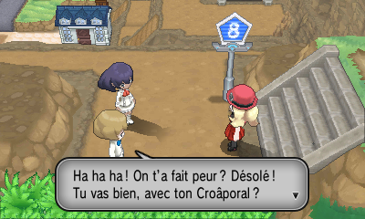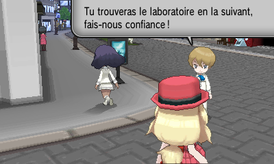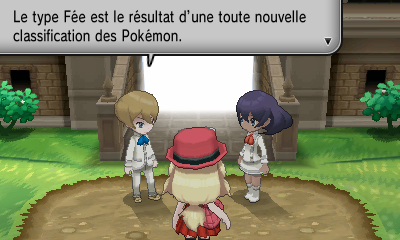 Une fois au bout de la route, vous êtes arrêté par Sina et Dexio. Le jeune homme recherche le Pokémon Flabébé et, heureux de constater que vous l'avez enregistré dans votre Pokédex, vous apprend que le type Fée est un tout nouveau type.