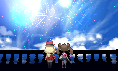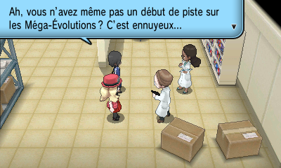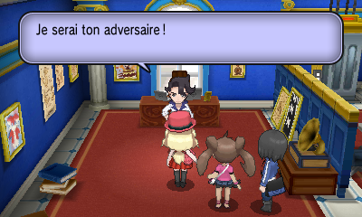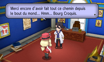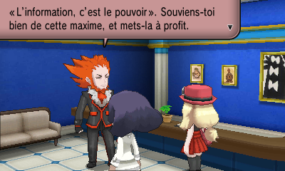 Il fait ensuite planer le mystère sur la Méga-Évolution et, après un petit brainstorming philosophique, vous êtes de nouveau libre de vos mouvements. Redescendez pour retrouver Sina, en compagnie d'un homme à la chevelure... remarquable. Il s'agit de Lysandre, qui cherche à faire de Kalos un monde meilleur et compte sur vous pour cela.