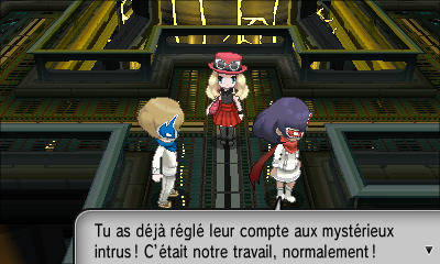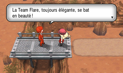 Arrivé en haut, vous surprenez une discussion entre deux éminences de la Team Flare. Ni une, ni deux, ils veulent vous régler votre compte. (Vous pouvez vous soigner entre les deux combats)