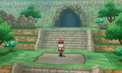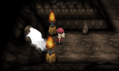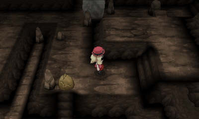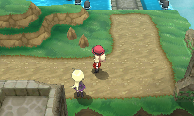 Descendez les marches, passez entre les pics rocheux et utilisez Force pour pousser le gros rocher jusqu'à son trou. Un Karatéka se trouve au nord et un Carbone peut être récupéré au-dessus de lui, tandis que vous tomberez sur un duo de dresseurs en montant les escaliers tout à l'ouest.
