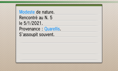 Chaque Pokémon, en plus de ses IV, possède une nature, qui n'est pas cachée, elle, et qui est inscrite dans son résumé.De Modeste à Timide, en passant par Assuré, il existe 25 natures différentes.